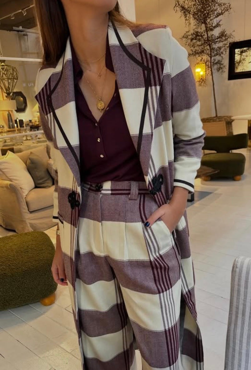 Abrigo blanco y burdeos